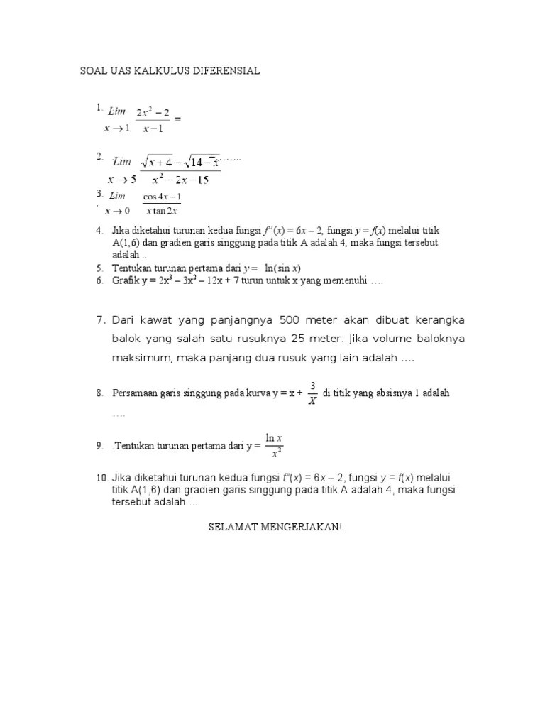40+ Contoh Soal Turunan Kalkulus. Ialah contoh soal turunan / diferensial yang merupakan salah satu materi kalkulus yang . Uji dengan turunan pertama untuk menentukan mana titik maksimum (titik balik maksimum). Turunan fungsi, contoh soal dan pembahasan. Tentang aplikasi turunan dalam kalkulus teknik informatika, konsep turunan, rumus dasar turunan, rumus turunan fungsi aljabar, sifat sifat turunann. Contoh soal aplikasi turunan (diferensial) pilihan ganda dan. Rumus turunan fungsi (diferensial) adalah fungsi lain dari suatu. Jika limit pada definisi turunan memang ada, maka dikatakan bahwa f. Contoh soal turunan beserta pembahasannya. Dapatkan soal dan rumus turunan / diferensial lengkap sd/smp/sma. 1 tentukan turunan pertama dari fungsi berikut: